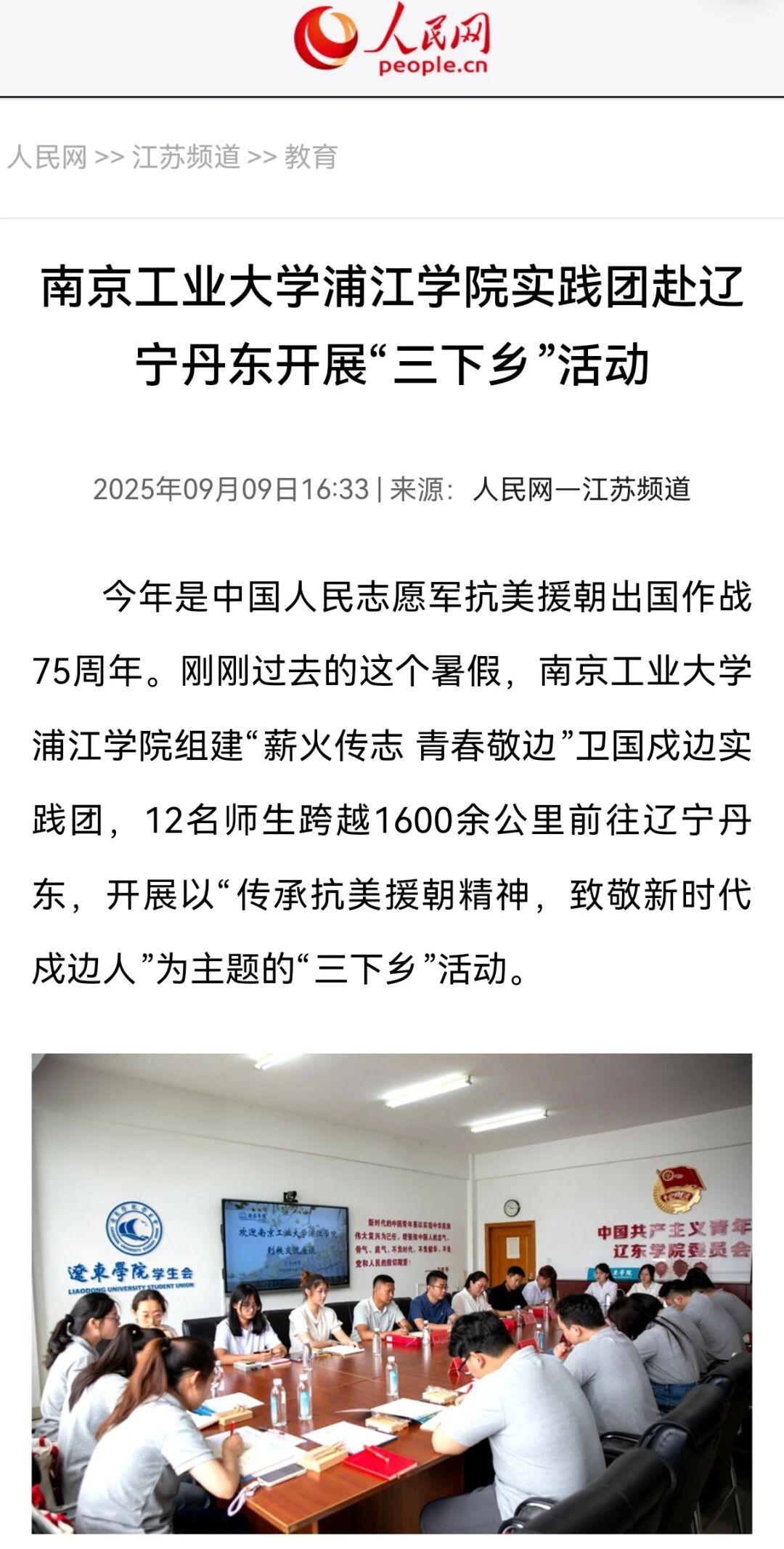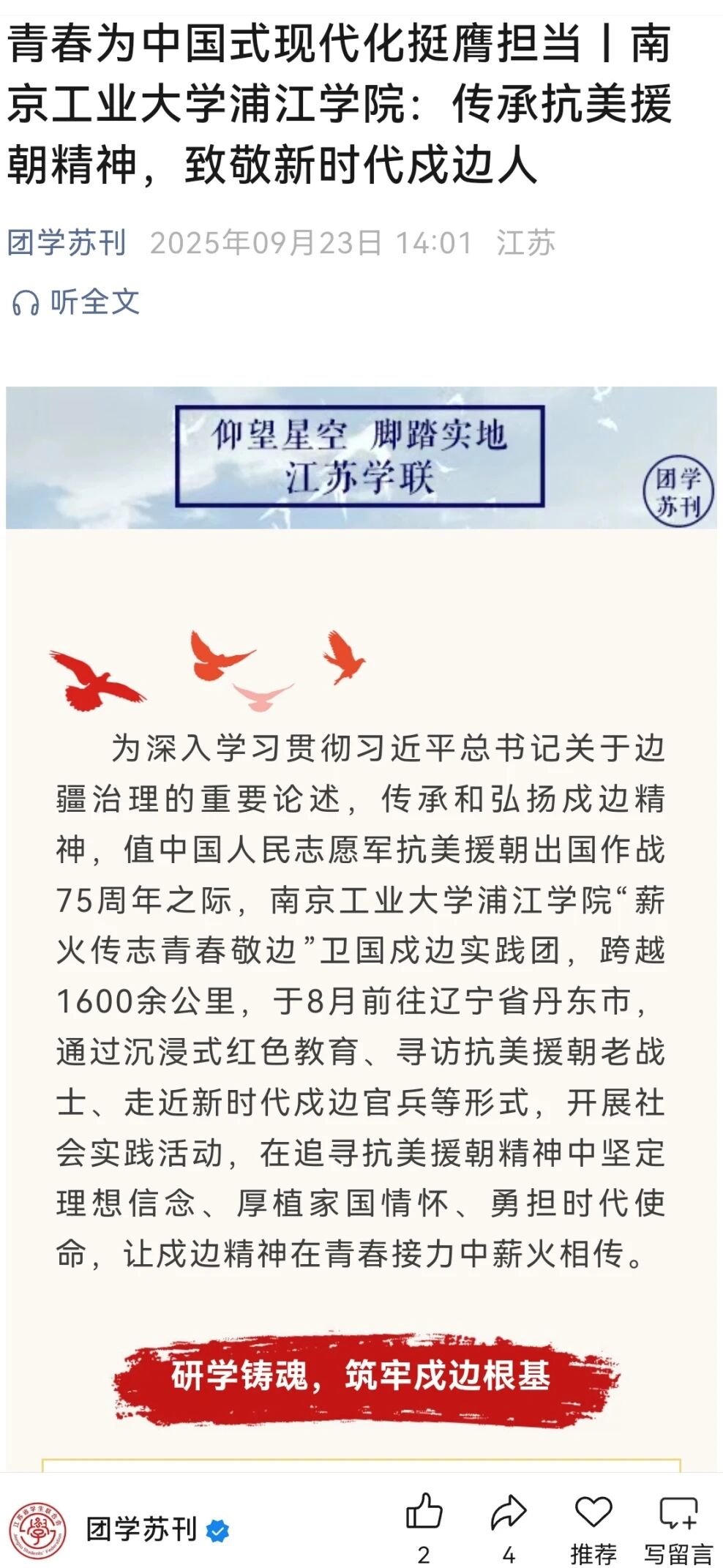 为深入传承红色基因、厚植家国情怀,校团委紧扣“传承抗美援朝精神,致敬新时代戍边人”主题,在中国人民志愿军抗美援朝出国作战75周年之际,于暑期组建卫国戍边实践团,通过“沉浸式红色教育、寻访抗美援朝老战士、走近新时代戍边官兵”等形式,开展“三下乡”社会实践活动。“行走的思政课”这一特色实践做法受到广泛关注,得到中央媒体人民网、省级媒体荔枝新闻和团学苏刊宣传报道,充分展现了学校坚持红色基因传承的正确导向、将思政教育从课堂延伸到实践的创新做法和综合育人的丰硕成果。