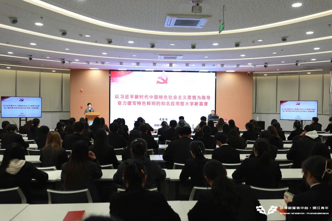 最后,结合学校发展目标,史金飞书记详细解读了 “建设特色鲜明的知名应用型大学” 的核心路径。他强调,学校始终坚守 “以生为本” 的办学理念与 “工作本位” 的办学宗旨,以学生就业与长远发展为核心,通过优化“2+1+0.5+0.5” 育人模式、强化实用技能培养、拓展 “3+2” 本硕衔接通道等关键举措,全力助力学生 “找到一份工作、找到一份好工作、找到一份越来越好的工作”。他指出,学校将持续深化 “党建与事业发展深度融合” 的工作思路,以高质量党建引领高质量发展:一方面夯实 “浦江实力”,依托优质举办方资源、专业化管理团队、特色优势学科与 “浦江红” 文化品牌,筑牢办学根基;另一方面抓实 “以生为本” 举措,聚焦学生反馈问题整改、优化育人体系、强化机关作风建设,不断提升服务效能与师生满意度。