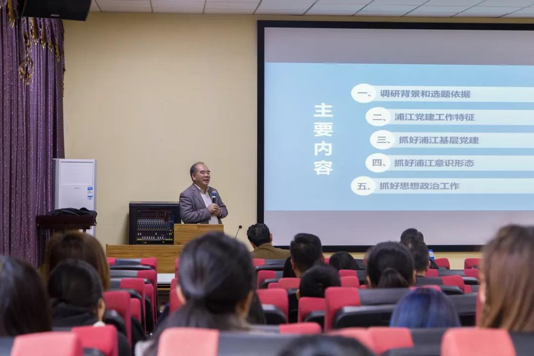 林萍华书记首先列举了浦江学院自成立以来的党建工作沿革,阐述了“主题教育”活动学在基本、学在要义;坚持查在根源、查在要害;坚持改在坚持、改在长远;坚持督在关键,督在核心的宗旨,并概述了在调研独立学院或民办大学的党建工作、访谈教师学生广泛听取建议、学习参考中央文件和政策规定后得到的几点认识:高校党建的初心使命是“为党育人,为国育才”,坚持和加强党在高校工作的政治核心作用,落实立德树人的根本任务;民办高校党建工作准则是要把政治建设放在学校建设首位、回归到立德树人的根本任务,与民办教育自身发展规律相结合;民办高校与公办高校党建工作的不同决定了两者开展党建工作方式的不同等。