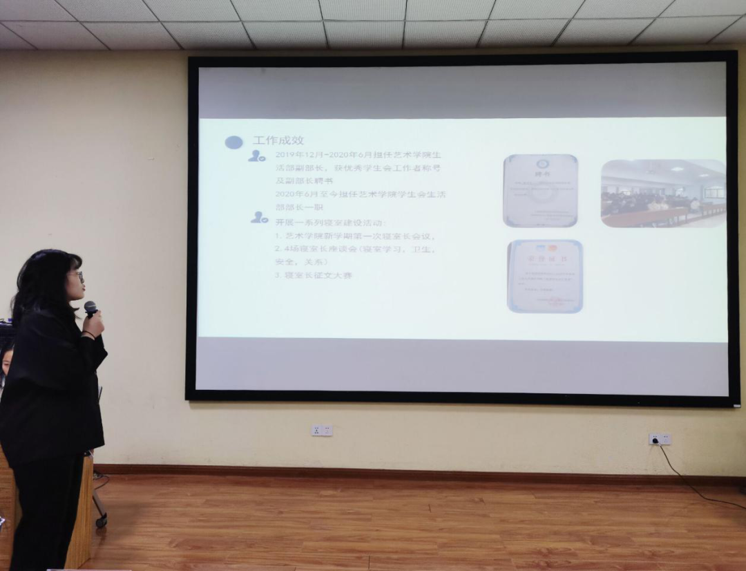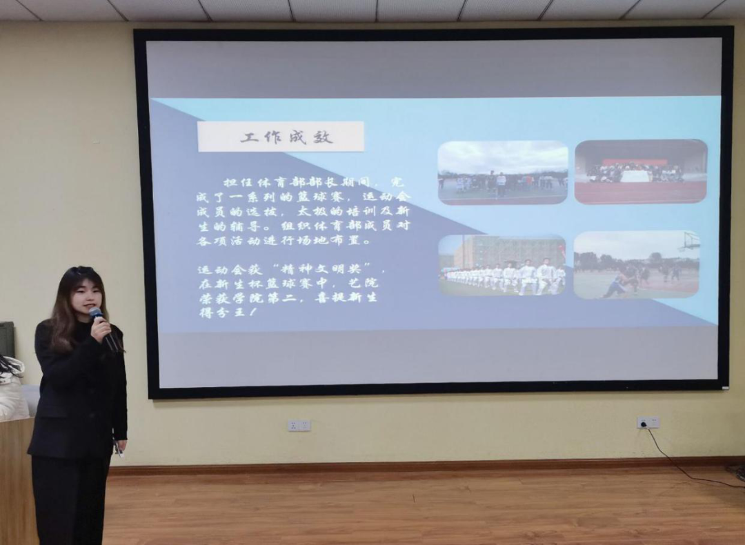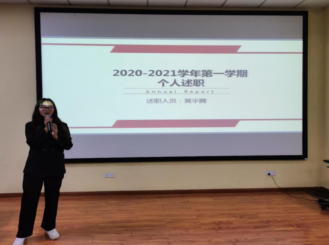 文艺部为丰富同学们的生活组织各式各样的活动,让同学们的技能得以展示。部长黄宇腾就她这学期的工作情况进行了个人述职。
