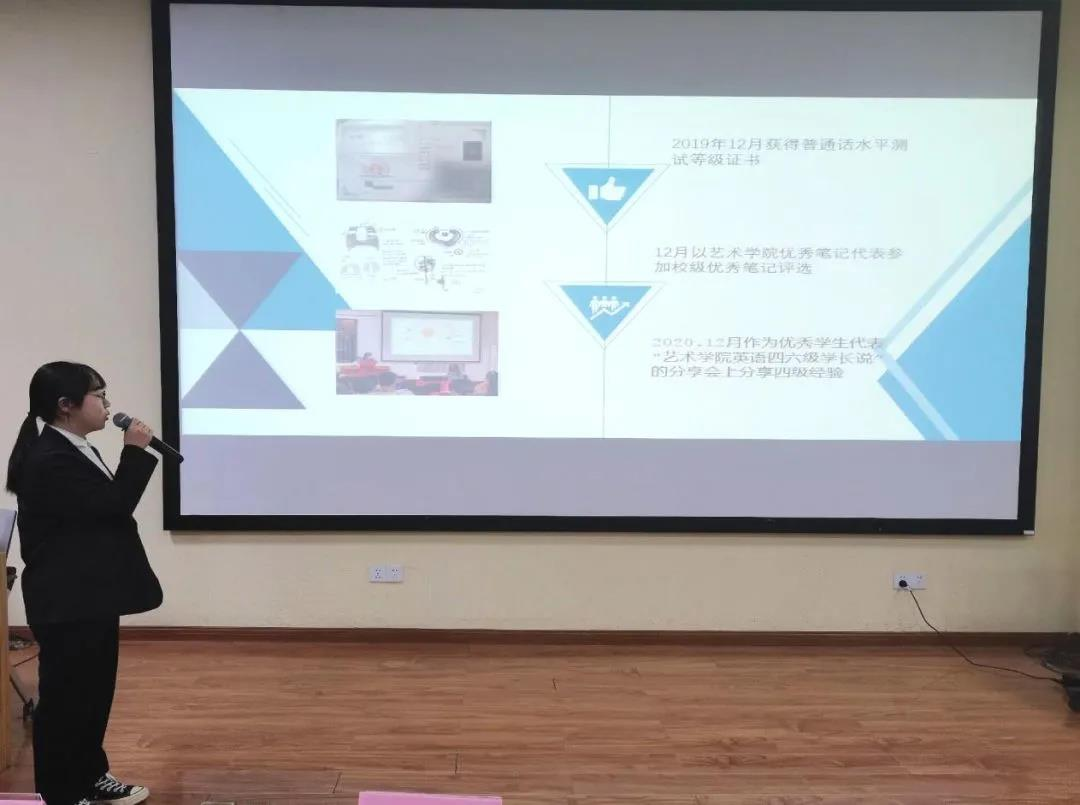 主席周慧珍就这一学期艺术学院组织的活动方面进行总结报告。她的话语让同学们明白,积极主动参与实践是不断锻炼自身能力素质的重要因素。