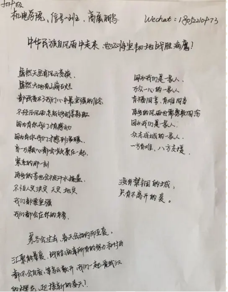 疫情的发生阻断了我们的脚步,却阻断不了爱。不是为感动谁,只是想借此表达自己的一些感受,但愿这几行文字能带来些正能量,没有在作品最后落下姓名,因为此刻我也只是一名为武汉加油,为中国加油的普通市民。让我们一起期待寒冬的结束,共同拥抱春暖花开。