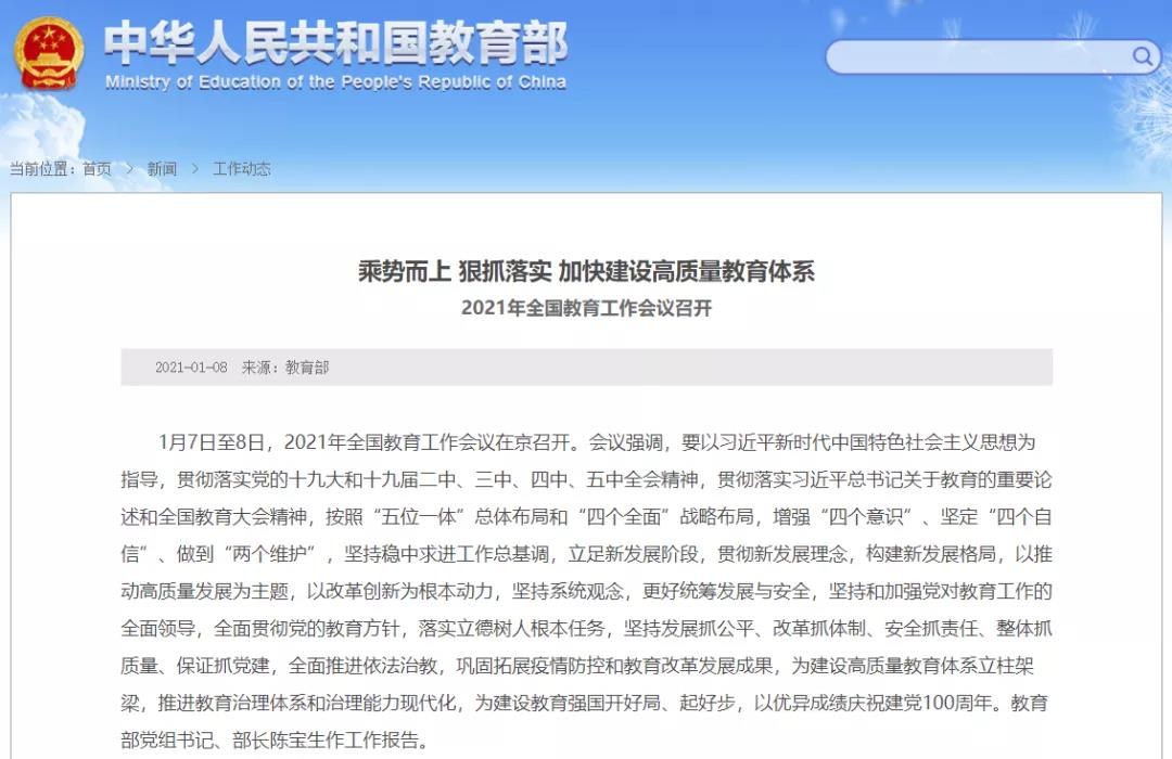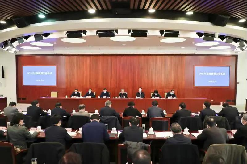 1月7日至8日,2021年全国教育工作会议在京召开。会议强调,要以习近平新时代中国特色社会主义思想为指导,贯彻落实党的十九大和十九届二中、三中、四中、五中全会精神,贯彻落实习近平总书记关于教育的重要论述和全国教育大会精神,按照“五位一体”总体布局和“四个全面”战略布局,增强“四个意识”、坚定“四个自信”、做到“两个维护”,坚持稳中求进工作总基调,立足新发展阶段,贯彻新发展理念,构建新发展格局,以推动高质量发展为主题,以改革创新为根本动力,坚持系统观念,更好统筹发展与安全,坚持和加强党对教育工作的全面领导,全面贯彻党的教育方针,落实立德树人根本任务,坚持发展抓公平、改革抓体制、安全抓责任、整体抓质量、保证抓党建,全面推进依法治教,巩固拓展疫情防控和教育改革发展成果,为建设高质量教育体系立柱架梁,推进教育治理体系和治理能力现代化,为建设教育强国开好局、起好步,以优异成绩庆祝建党100周年。教育部党组书记、部长陈宝生作工作报告。