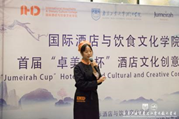 IHD学院张新南院长致开幕词。 张院长表达了对各位来宾的欢迎和感谢,并从酒店人要有一颗钻石般的匠心、IHD要打造自己的品牌活动及通过活动挖掘学生们的创新潜能三个方面阐述了举办本次大赛的初衷。随后,林萍华校长发言。他指出,IHD学院本次酒店文化创意大赛正是学校科技文化月活动的题中之义,为科技文化月开了一个好头。林校长表达了对本次大赛的美好祝愿,同时宣布首届“卓美亚杯”酒店文化创意大赛正式开幕。