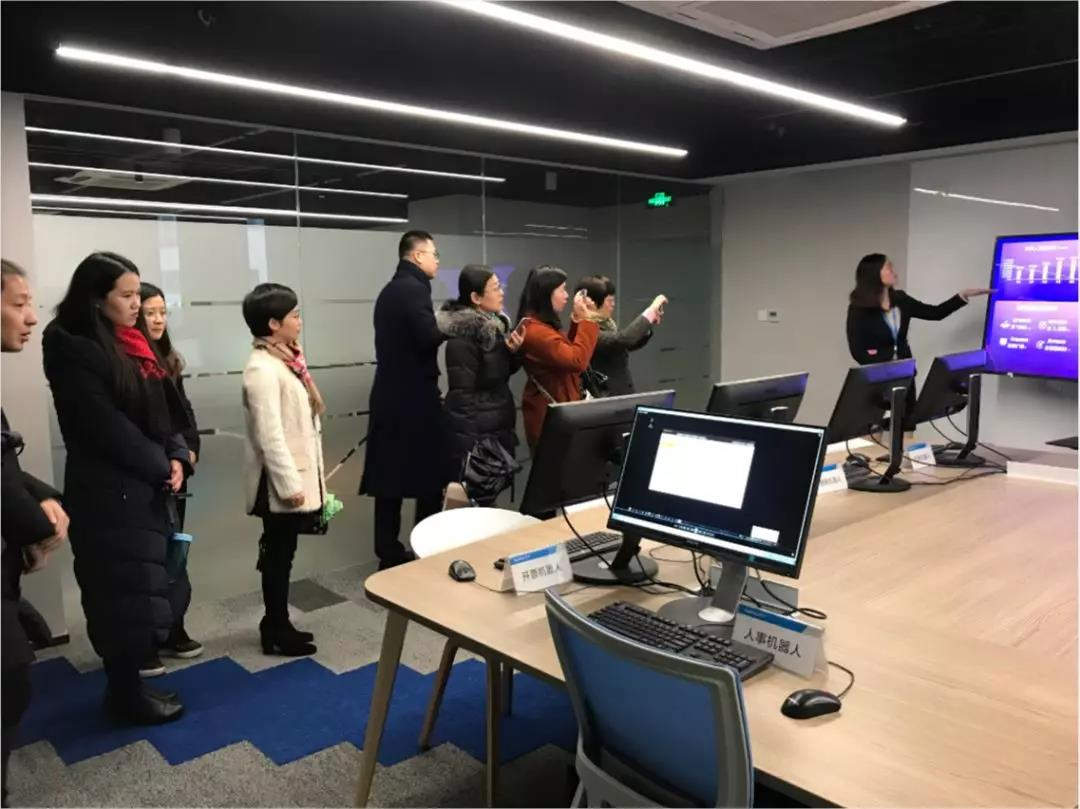 首先,苏宁云财财务服务中心钟方玲经理带领老师们参观了苏宁云财单证共享中心、服务外包中心、代账中心、核算共享中心以及数字员工工作室。在参观过程中,钟总耐心地解答老师们提出的各种问题,交流在愉快、热烈的氛围中进行。