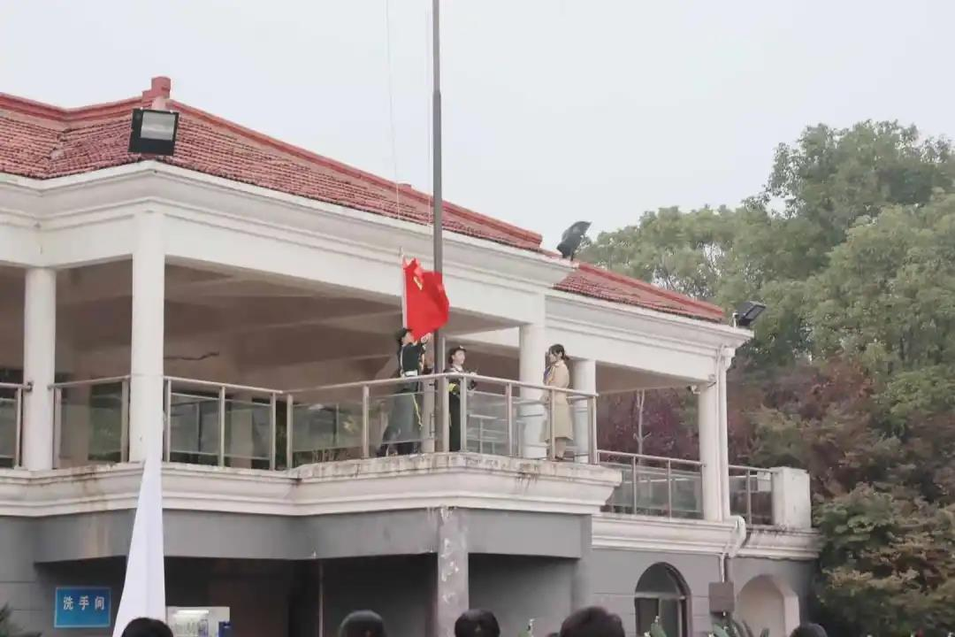 上午7时20分,伴随着雄壮的国歌声,五星红旗冉冉升起。现场师生怀着崇高的敬意向国旗行注目礼,并齐声高唱义勇军进行曲。每名师生都沉浸在这庄严而又神圣的时刻。