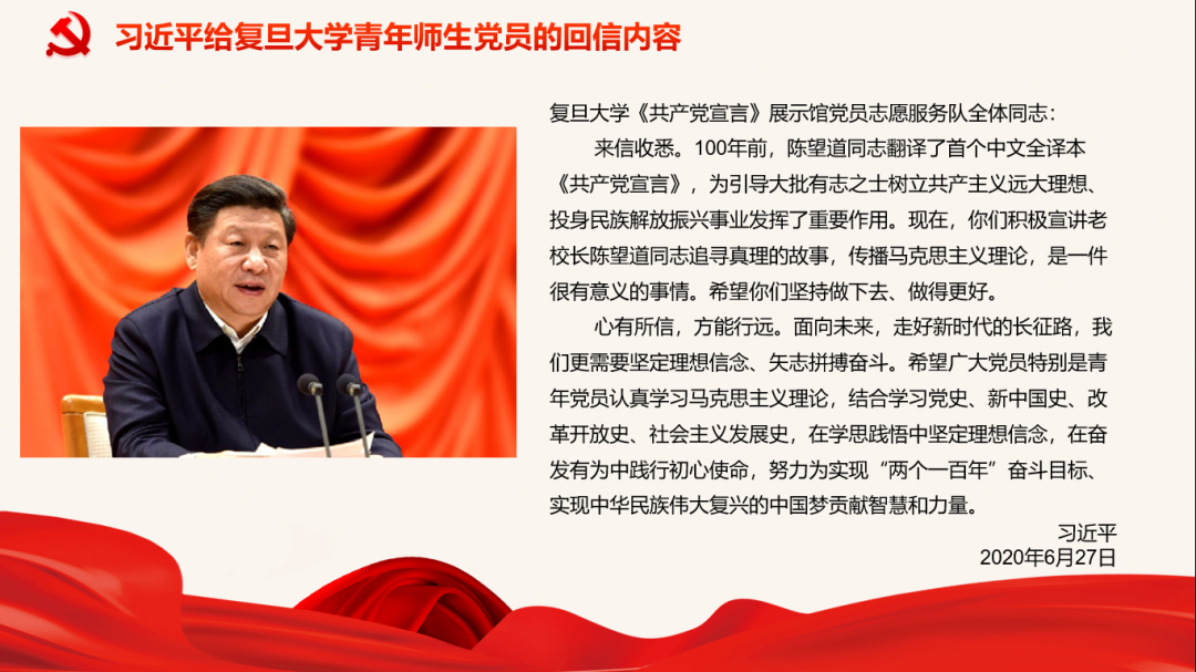 由2017级酒店管理2班孟小楠同学为大家朗读习近平给复旦大学青年师生党员的回信内容。