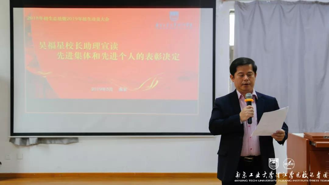 吴福星校长助理宣读了《2018年度招生工作先进集体和先进个人的表彰决定》。林萍华校长、王建成副校长、吴福星校长助理分别向三个先进组长和二十九位先进个人颁奖。