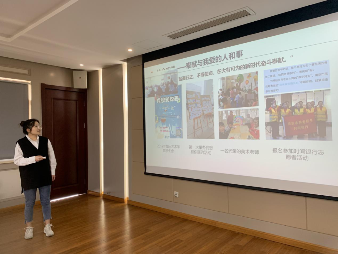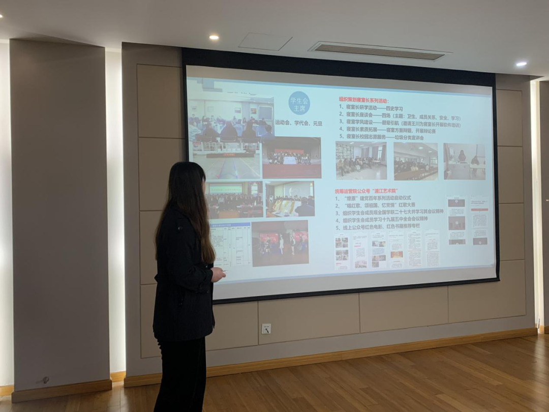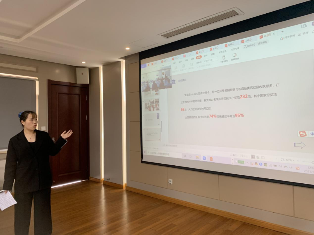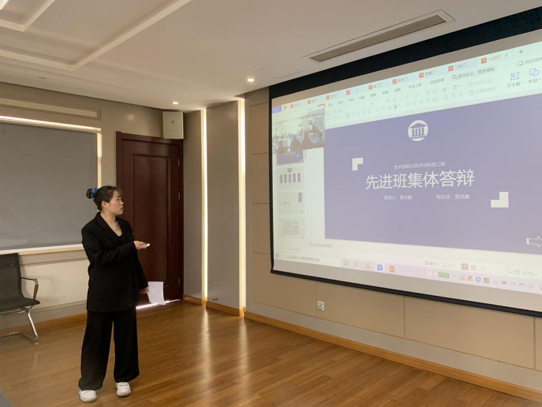 18级艺术与科技二班的吴玉婉,作为先进班集体的答辩人,她沉着冷静,有条不紊的介绍着自己的支部,班级制度建设分为班委会制度和组织制度,制度的合理完善,使班级获奖情况非常的可观。介绍期间,在座的所有人都对这个优秀的支部留下了深刻的印象。