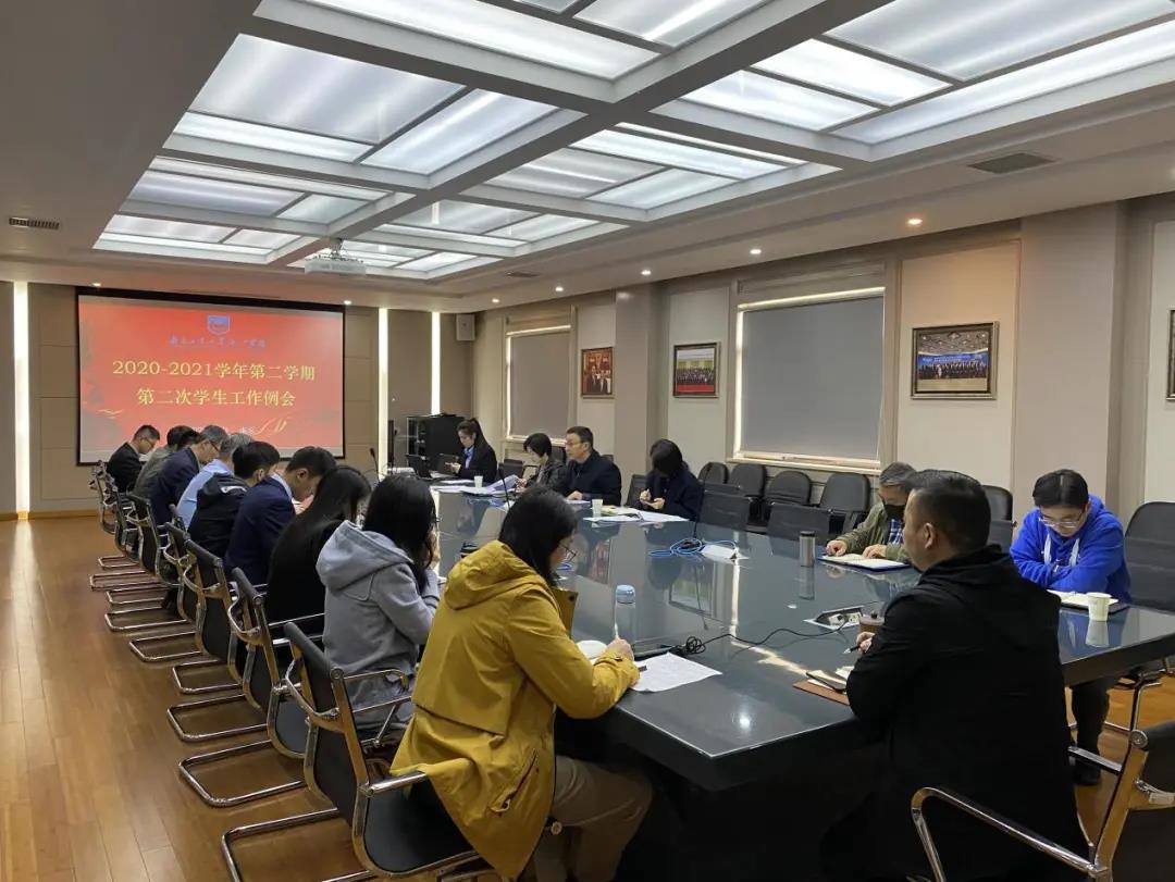 会议按照上级主管部门的要求,紧紧围绕学校中心工作,对学生教育管理相关工作进行了部署。朱永平副校长传达了全省资助工作视频会议精神,并从全面落实精准资助、深入推进资助育人、持续加强规范管理等方面对学校学生资助工作提出了要求。学工处、团委及艺术教育中心分别部署了庆祝建党100周年主题教育系列活动。学工处就今年进一步深化学风建设和学生党员发展工作做了安排和部署,并就新校区学生宿舍分配方案做了说明。教务处就“空中英语课堂”、学生考试违纪处理、学业预警和2022届毕业生图像信息采集等工作提出了要求。后勤服务处对新冠病毒疫苗接种工作作了具体安排。