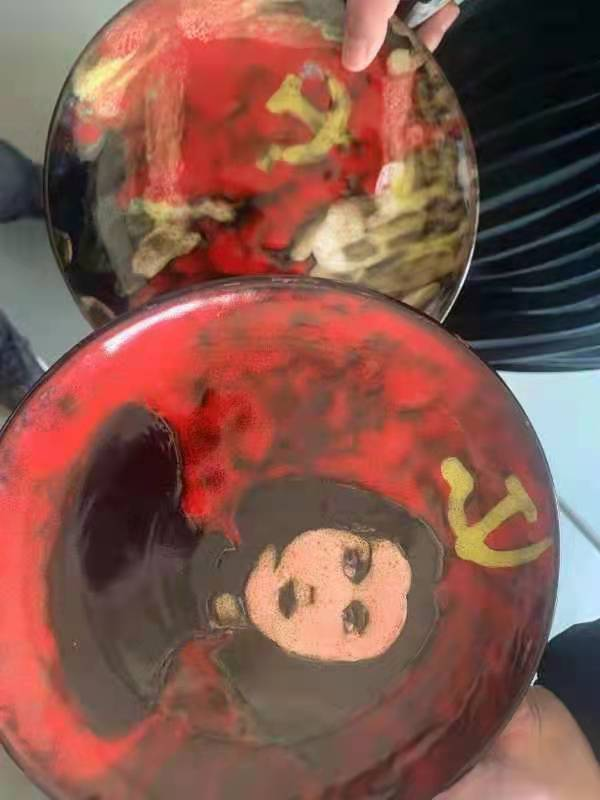 参与创作的老师和同学们,从选材到上釉再到烧制,耗时一天,共完成作品六十余件,包括英模人物、主题绘画、造型设计等多种画面表现形式。