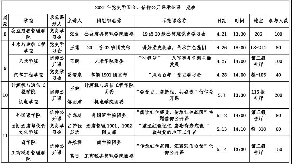 为深入学习贯彻习近平总书记在党史学习教育动员大会上的重要讲话精神,根据学校团委部署安排和《关于我校共青团开展“学党史、强信念、跟党走”学习教育的通知》(南工大浦团[2021]01号)文件精神,校团委组织学校各二级各级学院团委开展"党史学习会""信仰公开课"示范课,具体安排如下: