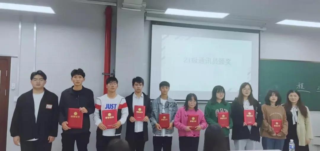 随后,进入大会的的第二个环节——由辅导员程路平老师以及辅导员助理王帅学长为21级军训通讯员颁奖。在学长学姐都不在学校的情况下,这些优秀的新生在辅导员及班助们的带领下,主动挑起协助班级管理,维持秩序的大梁。在军训期间的表现优异,展现出新生们蓬勃的朝气,勇于拼搏的精神。