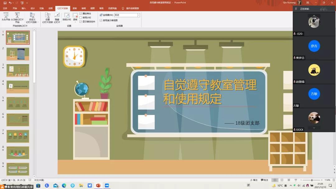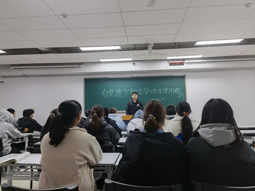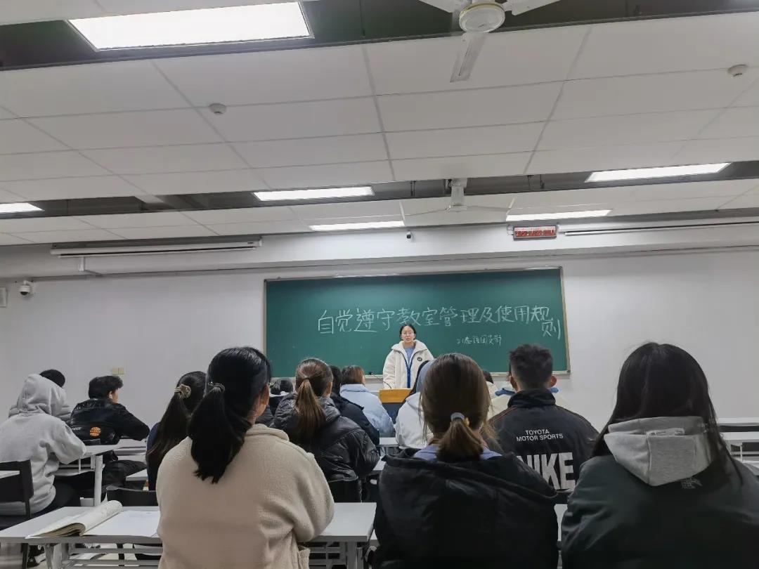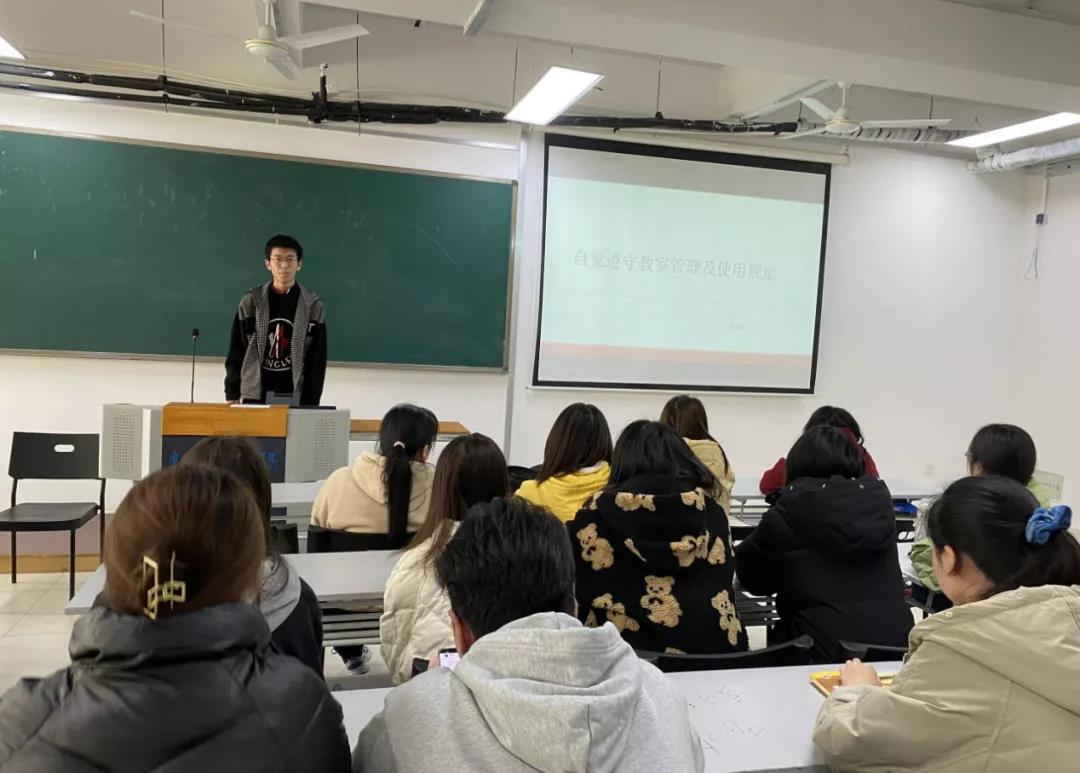 在陈思丹同学的带领下,21级的同学们也进行了遵守教室管理及使用规则的学习班会。在该班会上,同学们了解了学校的管理要求和班级的教室的学习的课堂纪律要求和晚自习纪律、迟到出勤率等管理要求。