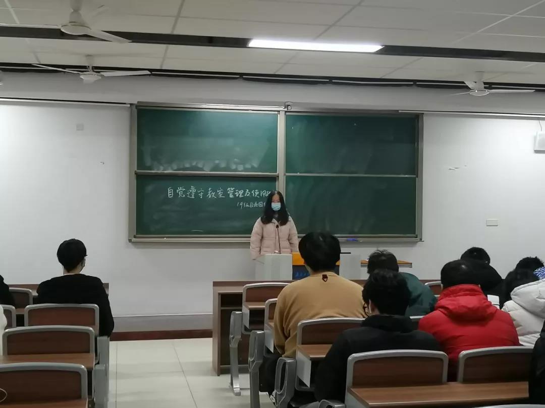 “自觉遵守教室管理及使用规定”的主题教育活动上,南钧玮同学讲解了教室的作用,并提倡大家在教室里做与其符合的行为。